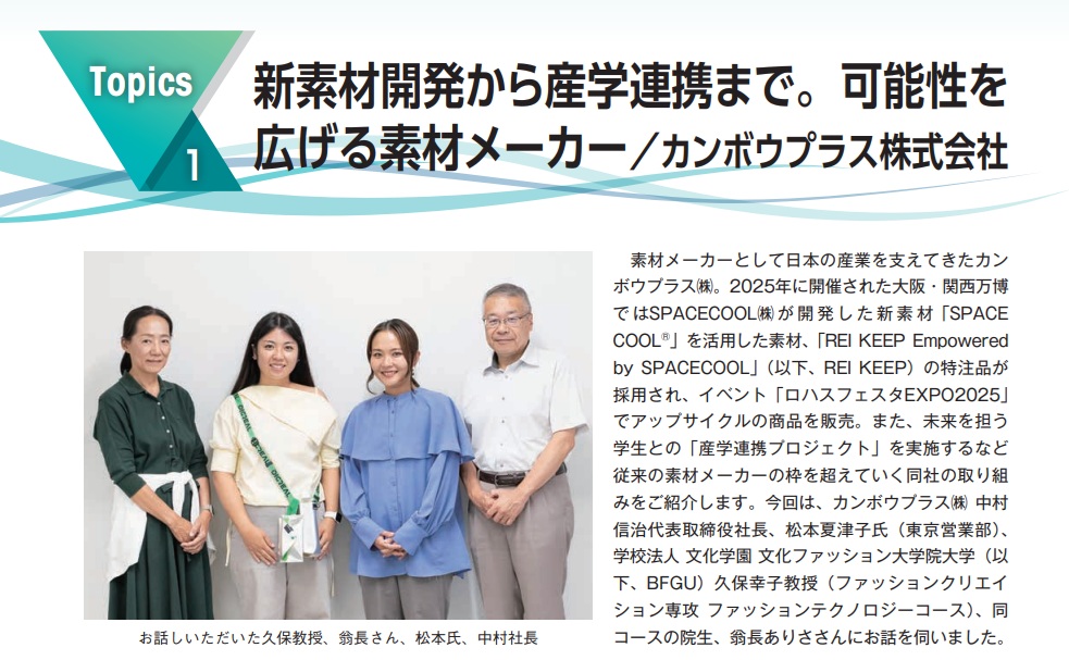 2025.11.27 お知らせ 塩化ビニル環境対策協議会(JPEC)の公式HPに、カンボウプラスのアップサイクル製品企画の取り組みについての記事が掲載されました。 塩化ビニル環境対策協議会(JPEC)の公式HPに、カンボウプラスの産学連携やアップサイクル製品企画の取り組みについての記事が掲載されました。今月11月発行の業界紙『PVC NEWS 125号』にも掲載いただいています。 下記URLからもお読みいただけます。 PVC news | 塩化ビニル環境対策協議会